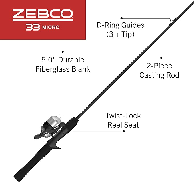 - EASY-TO-USE: The Zebco 33 Micro spincast combo features a 5-foot 2-piece fishing pole and size 10 fishing reel. You will be ready to hit the water with the patented no-tangle design reel that comes pre-spooled with 4-pound Zebco Cajun line. Whether you’re curious or serious about fishing, the reel that taught America to fish makes it easy